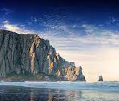 City beach featuring the iconic Morro Rock, plus sandy dunes & seasonal lifeguards.